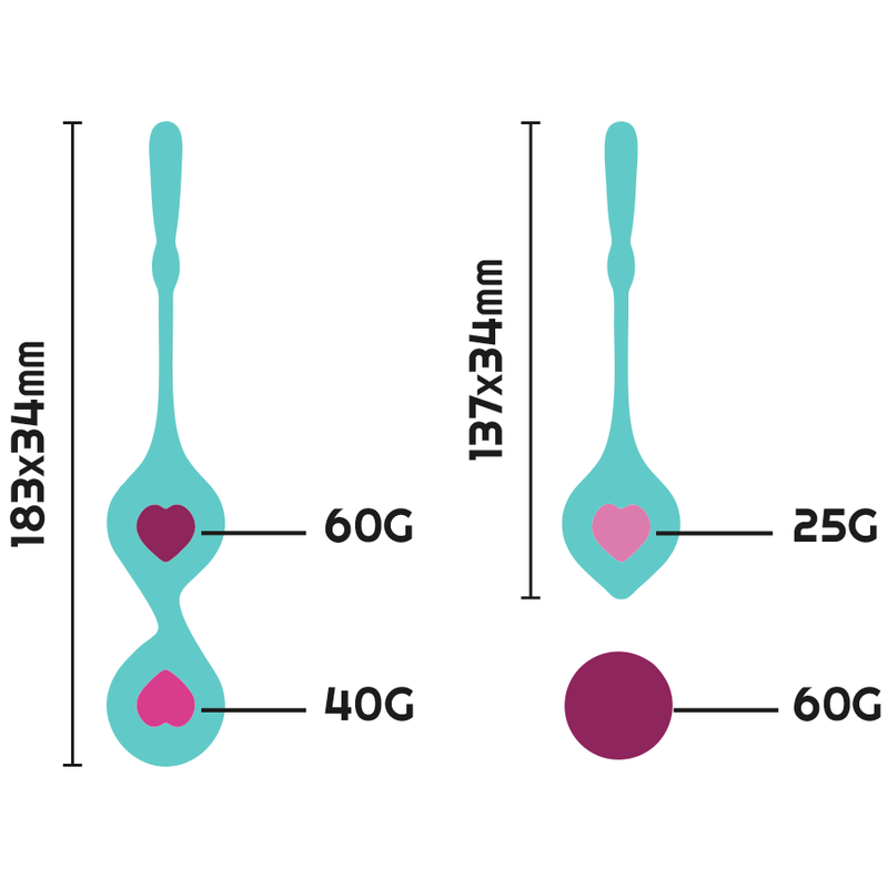 Deva de Rithual incluye 4 bolas de diferentes pesos: 60g, 25g, 40g, y 60g para combinarlas y crear el programa de ejercicios.