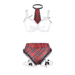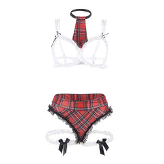 Incluye panty y sujetador, acompañado de liga y corbata para un look coordinado y seductor. -